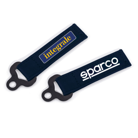 Hergestellt aus Mikrofaser mit Lederoptik in Marineblau, hat dieser Schlüsselanhänger auf einer Seite das Sparco Logo und auf der anderen Seite das Integrale Logo aufgedruckt.