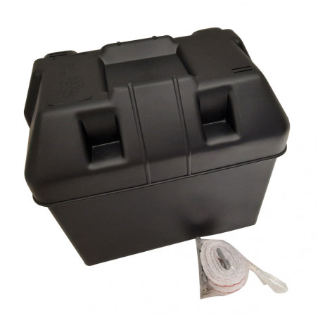 Waterproof and solid battery box in polypropylene, supplied with cover and closure straps.