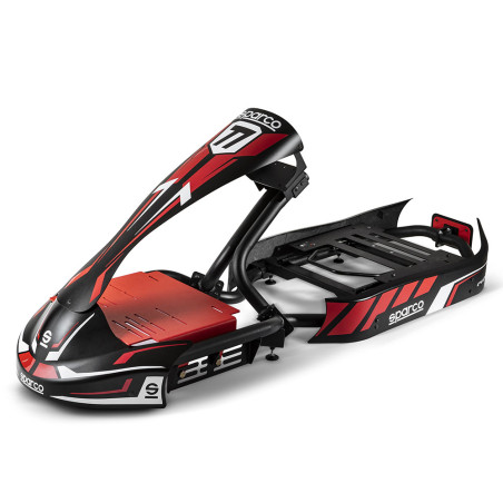 Ce cockpit de karting Sparco Gaming Evolve est spécifique pour la position de conduite du kart, complet avec carénages en fibre de verre avec graphiques d'inspiration karting.